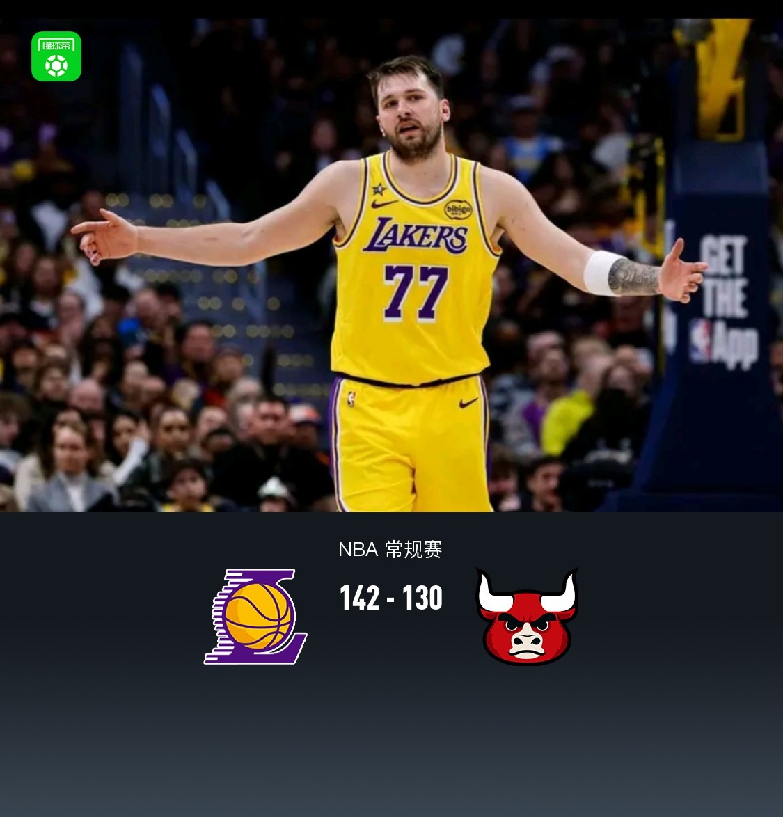 北京时间3月13日NBA 常规赛,洛杉矶湖人对阵芝加哥公牛。上半场双方展开对攻战,半场湖人67-62公牛,第三节湖人东契奇单节17分带队一度领先22分,三节结束公牛追至10分分差,末节公牛无力反扑,最终湖人142-130公牛。