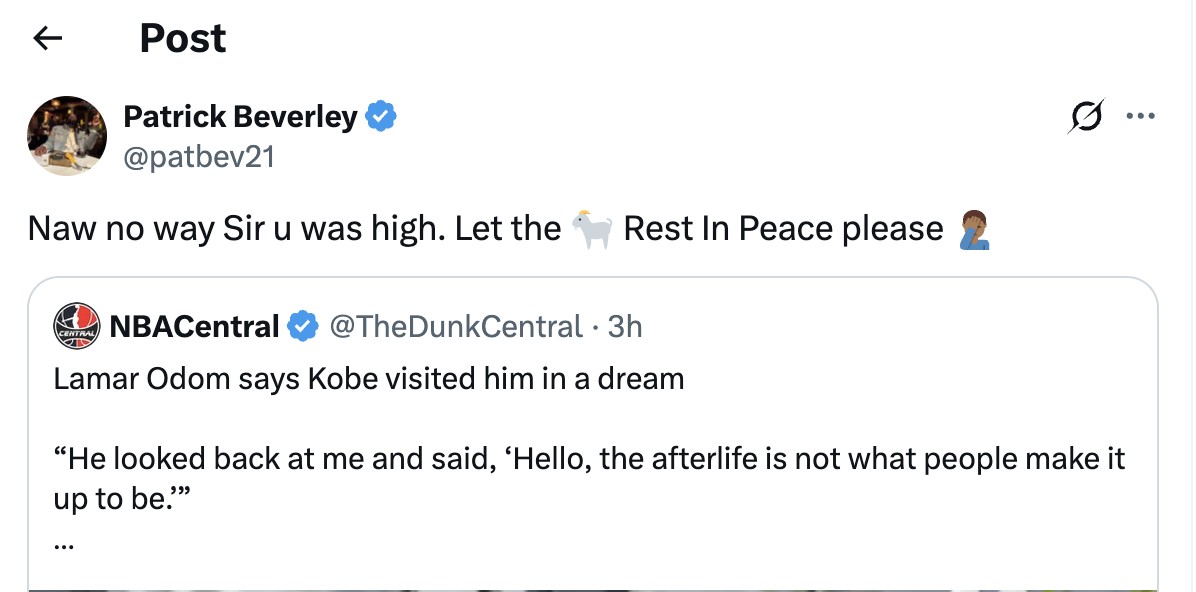 不久后,贝弗利在个人社交媒体写道:“别这样,老兄,你当时肯定是又磕嗨了,请让这位史上最伟大的球员安息吧。”