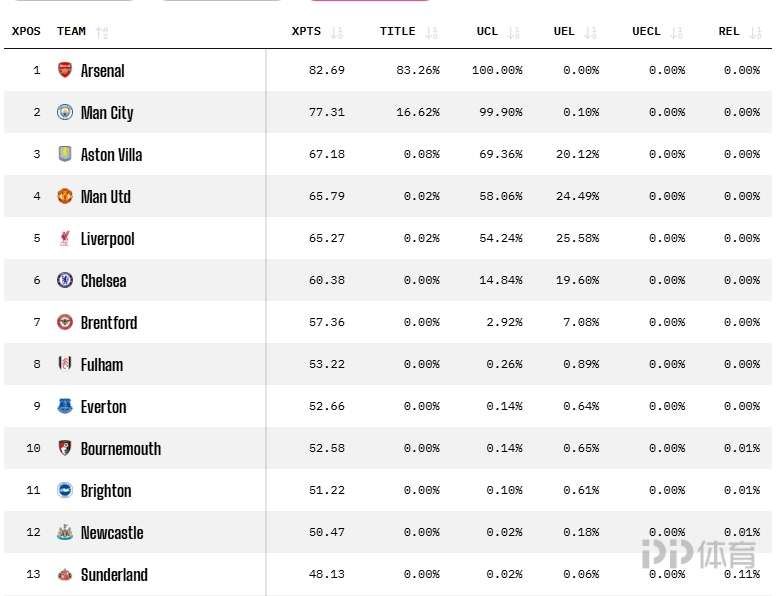 英超最新夺冠概率:阿森纳83% 曼城16% 曼联0.02%