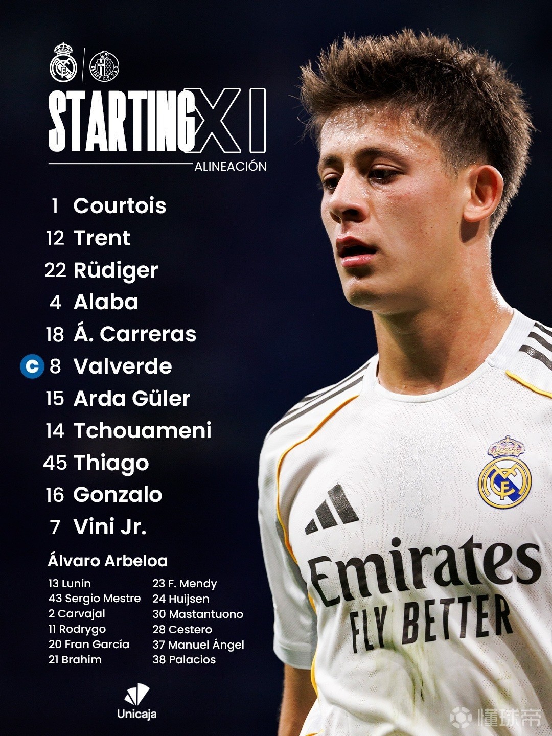替补:13-卢宁、23-门迪、43-梅斯特雷、24-赫伊森、2-卡瓦哈尔、30-马斯坦托诺、11-罗德里戈、28-塞斯特罗、20-弗兰-加西亚、37-曼努埃尔-安赫尔、21-卜拉欣-迪亚斯、38-帕拉西奥斯