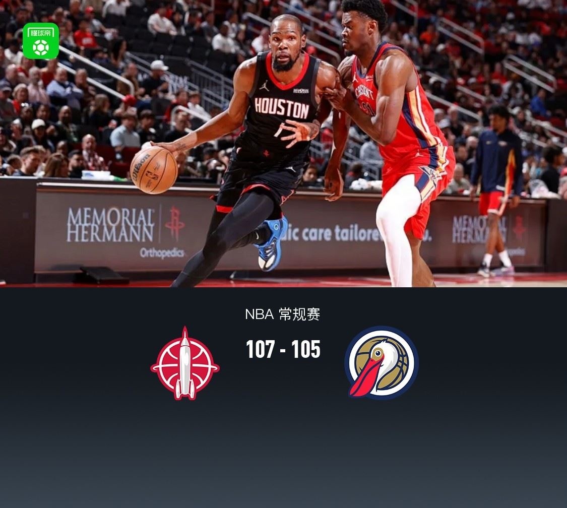 第四节,开节鹈鹕穆雷、墨菲联手得分迅速追平比分,火箭史密斯、杜兰特、谢泼德得分再度领先7分,鹈鹕锡安冲框再度追至2分,火箭谢泼德3+1,阿门造杀伤罚球领先8分,比赛还剩4分钟火箭仍领先7分,鹈鹕穆雷领衔一波12-1反超4分,随后火箭史密斯三分续命,比赛来到最后时刻,鹈鹕穆雷踩边线失误,火箭杜兰特中投反超1分,随后鹈鹕再度失误,火箭杜兰特两罚全中领先3分,火箭也采取犯规战术,穆雷第一罚命中,第二罚故意罚丢搏得前场板墨菲漂移三分不中错失绝杀,最终火箭107-105战胜鹈鹕。