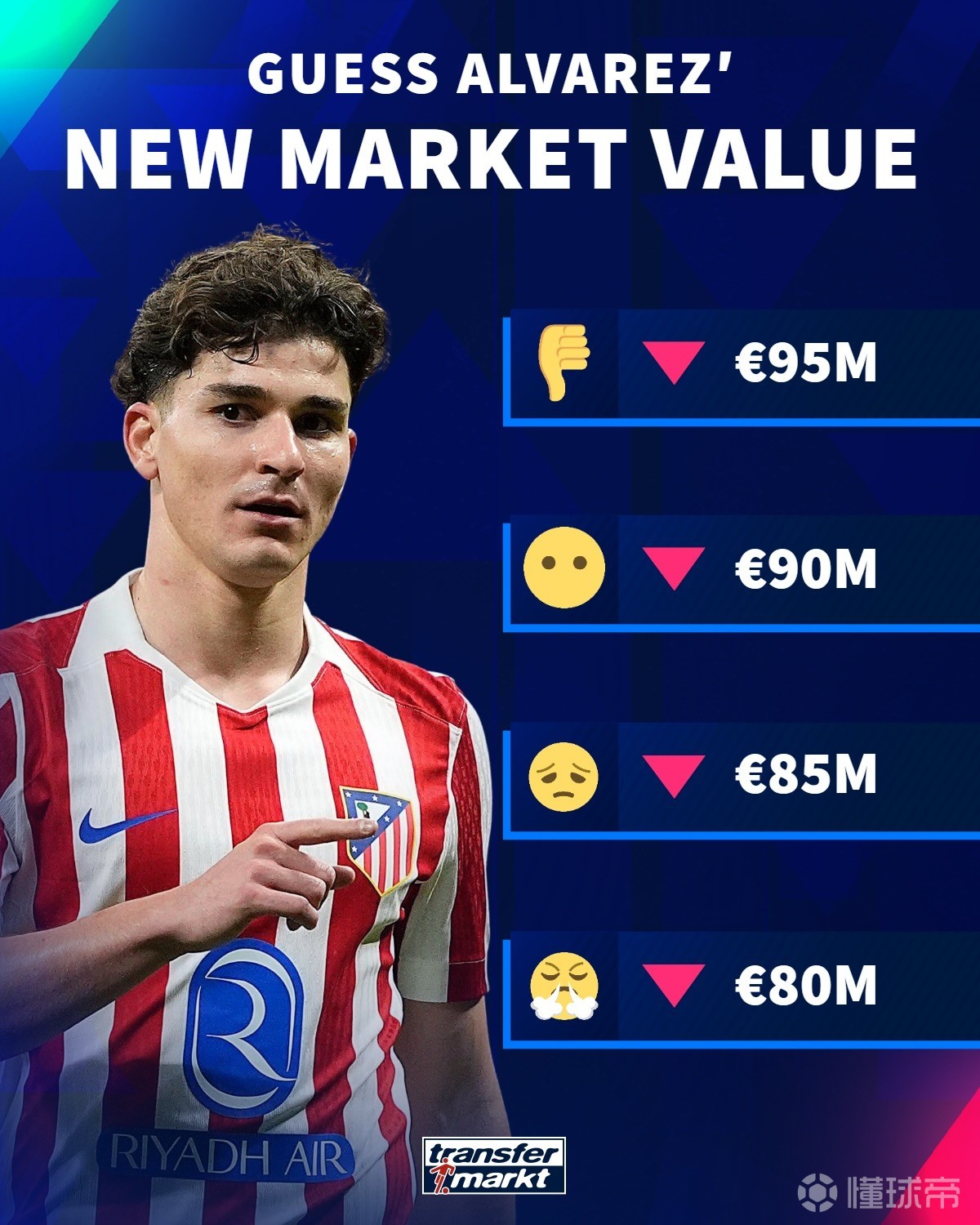 在此之前,德转官方预热阿尔瓦雷斯身价下跌,并列出了几个可能的身价,分别是9500万欧、9000万欧、8500万欧和8000万欧。
