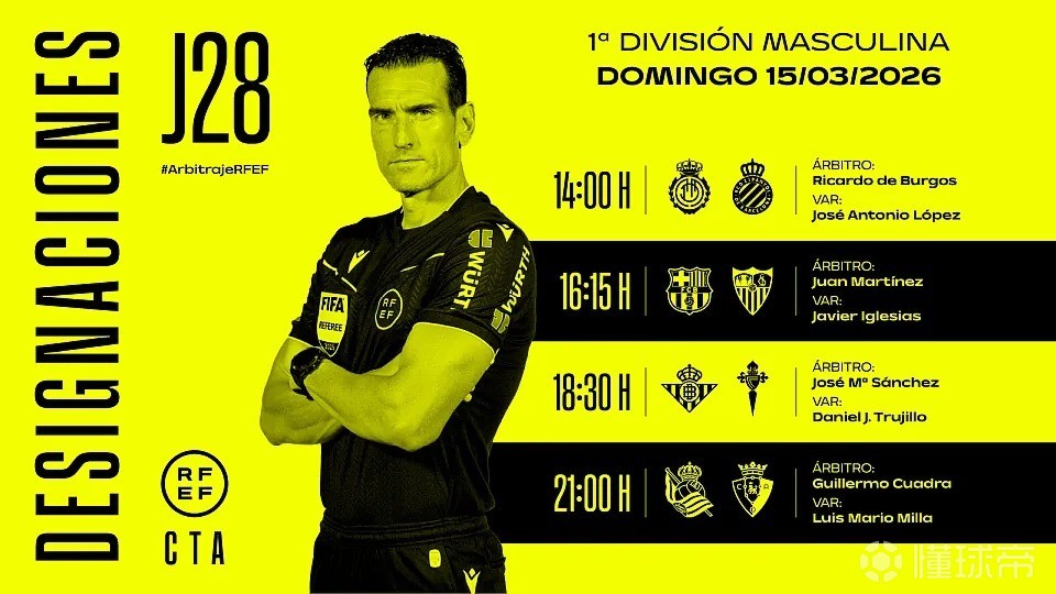 西班牙足协官方公布了周日4场西甲比赛的裁判安排,胡安-马丁内斯将执法巴萨vs塞维利亚。