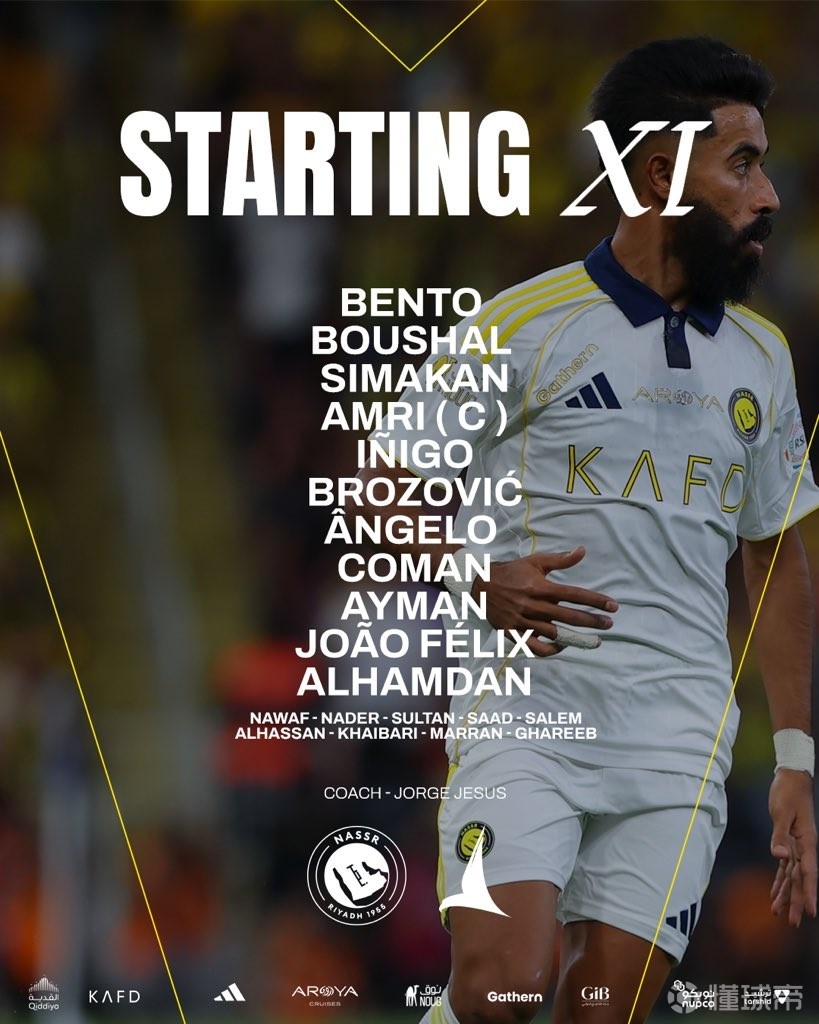 利雅得胜利首发:24-本托、26-伊尼戈-马丁内斯、5-阿卜杜拉-阿姆里、3-西马坎、12-纳瓦夫-布歇尔、23-艾曼-叶海亚、20-安热洛-博尔热斯、11-布罗佐维奇、21-金斯利-科曼、9-阿卜杜拉-哈姆丹、79-菲利克斯
