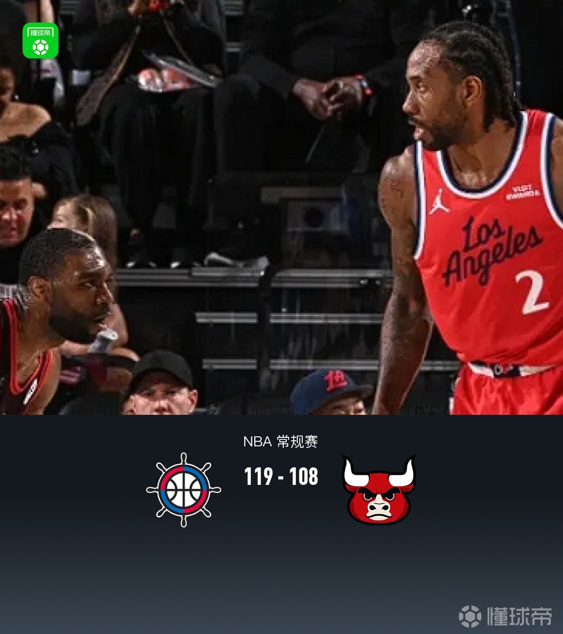 快船119-108公牛,伦纳德28分,马图林26+6,吉迪20+11+10
