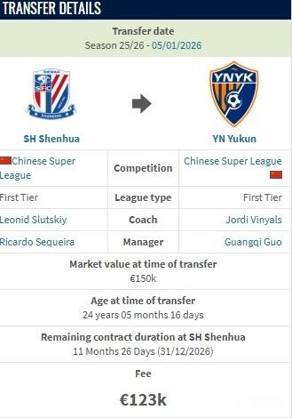 德转:费尔南多从申花加盟云南的转会费约100万人民币