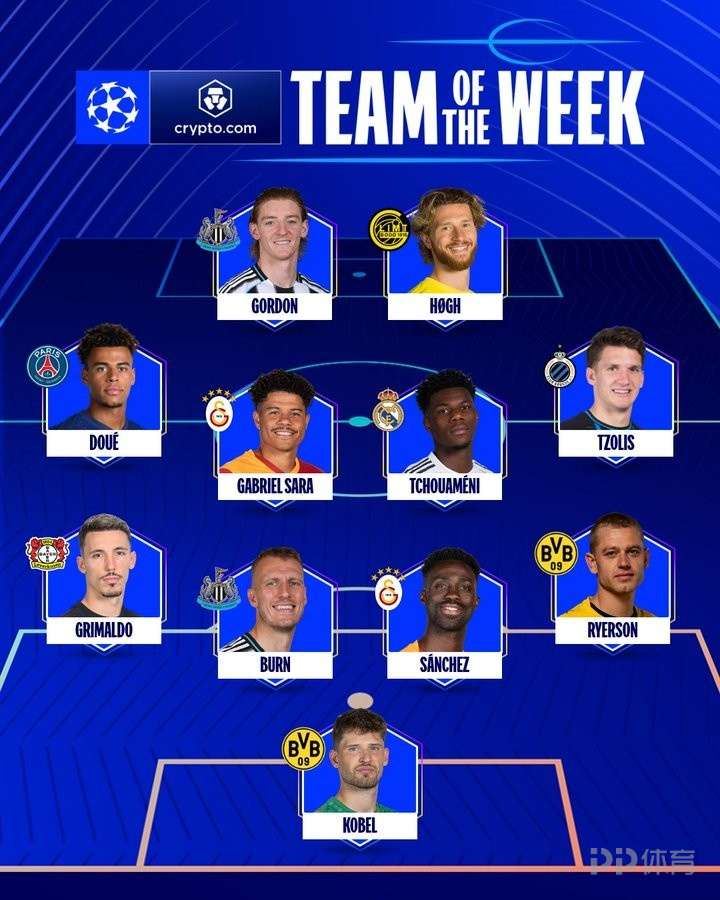 欧冠官方本周最佳阵容:楚阿梅尼、戈登、杜埃在列